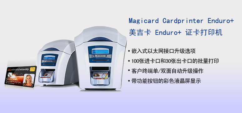 产品型号: Enduro+:Magicard Enduro+单面卡片打印机(产品编号:3633-9001) Enduro+ Mag:Magicard Enduro+单面卡片打印机(带磁条编码器)(产品编号:3633-9002) Enduro+ Smart:Magicard Enduro+单面卡片打印机(带接触/非接智能卡编码器)(产品编号:3633-9005) Enduro+ Duo:Magicard Enduro+双面卡片打印机(产品编号:3633-9021) Enduro+ Duo Mag:Magicard Enduro+单面卡片打印机(带磁条编码器)(产品编号:3633-9022) Enduro+ Duo Smart:Magicard Enduro+双面卡片打印机(带接触/非接智能卡编码器)(产品编号:3633-9025)